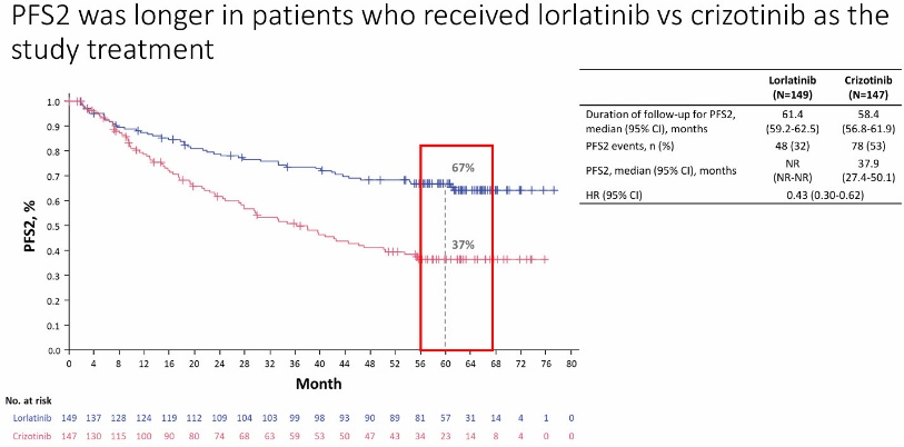 中位随访61.4个月后,洛拉替尼为一线用药的3+X序贯治疗的中位PFS2仍未达到(NR)(95%CI:NR-NR),而克唑替尼一线治疗组中位随访58.4个月后的中位PFS2为37.9个月(HR=0.43),再次印证了一线应用洛拉替尼在延长无进展生存方面的显著优势。洛拉替尼组的3年PFS2率高达74%[4],5年PFS2率高达67%[3],表明洛拉替尼组的临床获益在后续全身抗肿瘤治疗中得以维持,3+X模式获益“后劲”很强。