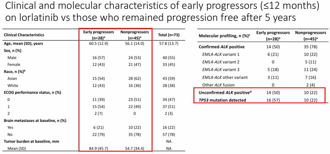 在CROWN试验中,相比5年未进展患者,早期进展(≤12个月)患者的基线肿瘤负荷更大,未确认ALK阳性的患者比例更高,携带TP53突变的比例更大(57%vs 22%),但EML4-ALK变异亚型似乎并没有显著差别。