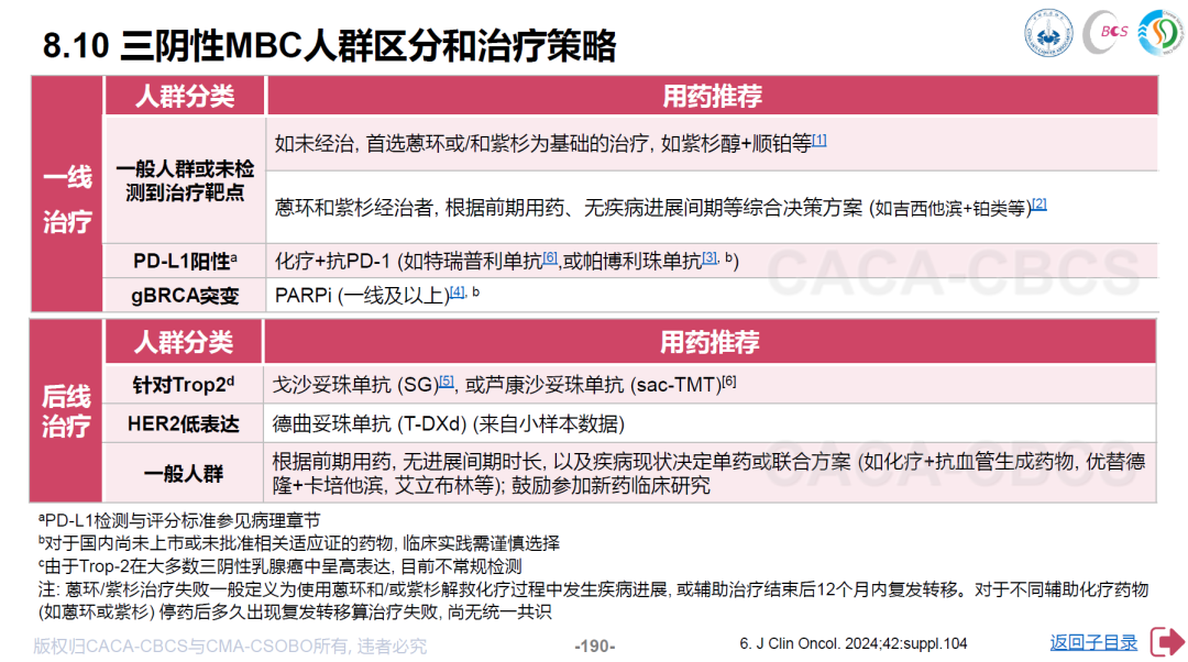 在三阴性乳腺癌(TNBC)领域,基于TORCHLIGHT研究将特瑞普利单抗纳入一线治疗推荐,主要针对PD-L1 CPS≥1分人群;基于OptiTROP-Breast01研究,芦康沙妥珠单抗(SKB264)则新增入三阴性乳腺癌的后线治疗推荐方案中。