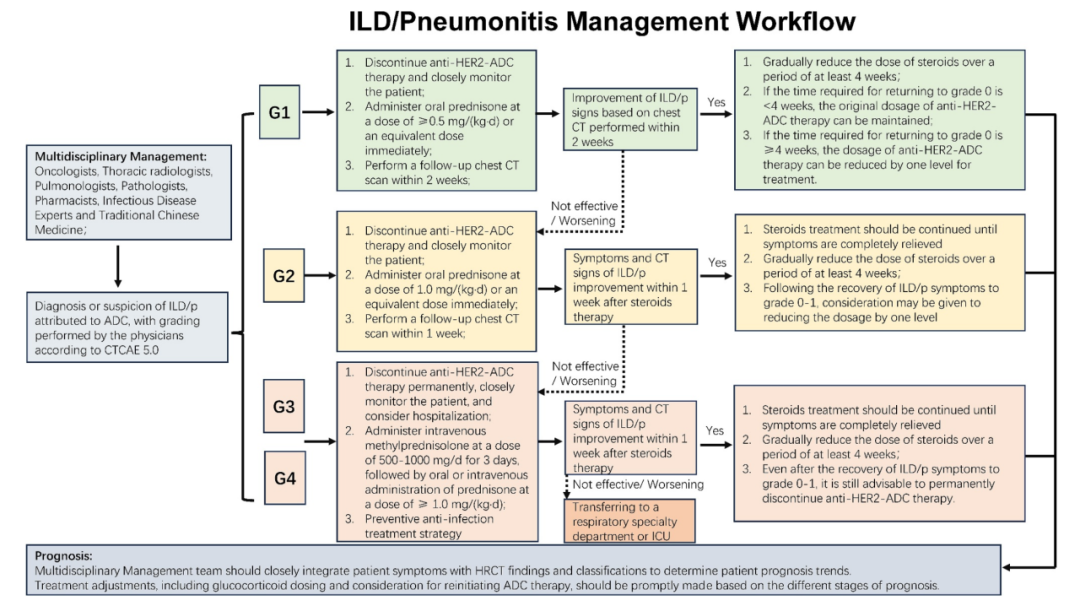 对于无症状患者(CTCAE 1级),必须暂时停止抗HER2 ADC治疗。尽管关于1级T-DXd相关ILD/p的类固醇治疗的考虑或推荐的决策在最近发布的指南中似乎存在差异,但专家组根据与中国患者积累的治疗经验,决定在本共识中推荐对1级ILD/p进行初始系统类固醇治疗方案,如泼尼松龙每天0.5 mg/kg或其等效物。在开始类固醇治疗的前2周内,根据胸部CT和其他临床指标评估ILD/p是否改善至关重要。如果恢复到0级的时间少于4周,则建议逐渐减少类固醇剂量(至少4周)。此外,当ILD/p相关症状完全缓解时,可以考虑以原始剂量水平恢复抗HER2 ADC治疗。如果所需时间超过4周,则可以根据医生的考虑降低一级剂量进行治疗。