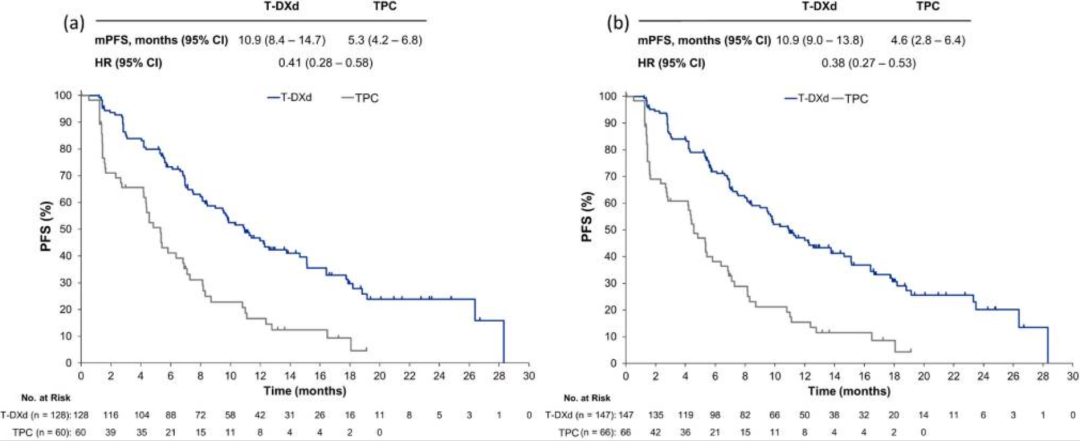 在DESTINY-Breast04研究中有213例患者来自亚洲国家或地区,147例分配至T-DXd组,66例分配至TPC组,两组有近90%的患者为HR+。结果显示,亚洲总人群T-DXd组和TPC组的中位无进展生存期(PFS)为10.9个月和4.6个月,HR+人群的mPFS分别为10.9个月和5.3个月(图2)。