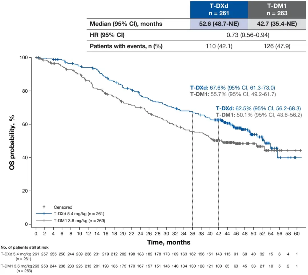 2024年ASCO年会披露了DESTINY-Breast03研究的生存结果最新数据。截至2023年11月20日,T-DXd组的中位随访时间为43.0个月,T-DM1组为35.4个月。结果显示,T-DXd和T-DM1治疗组的mOS分别为52.6个月和42.7个月,T-DXd显著降低死亡风险27%(HR=0.73,95%CI 0.56-0.94),两组36个月的OS率分别为67.6%和55.7%,T-DXd的生存获益得到了有效维持(图8)[7]。
