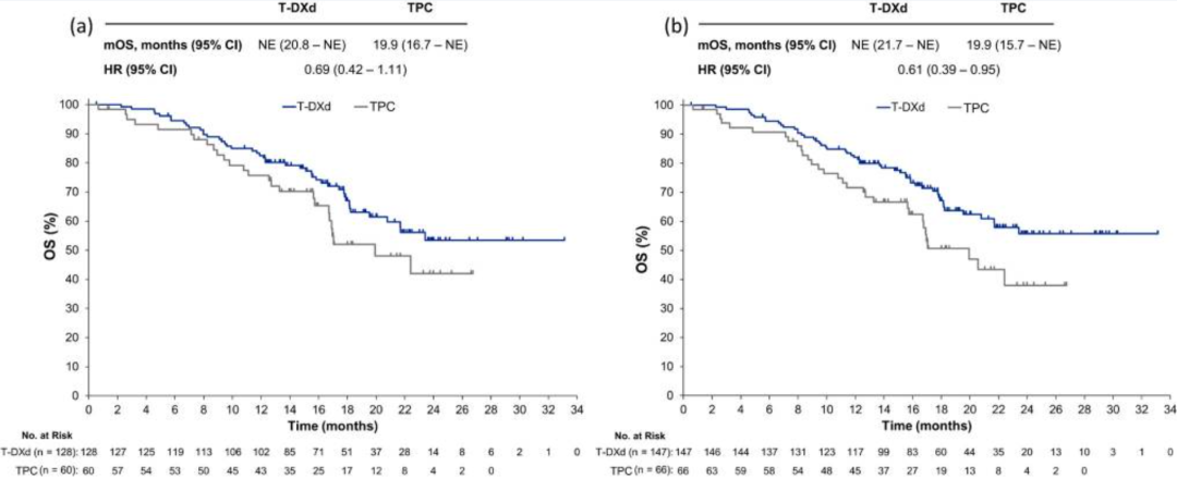 2023年ESMO发布了该研究中位随访32个月的OS结果,显示在总人群中T-DXd和TPC组的mOS分别22.9个月和16.8个月;在激素受体阳性(HR+)人群中的mOS则分别为23.9个月和17.6个月(图1)[1]。