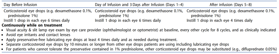 治疗期间持续进行以下护理:在基线时、每两个周期进行8个周期的视力和裂隙灯眼部检查,并根据临床需要进行。避免眼部刺激物和隐形眼镜。在治疗期间,每天至少4次并根据需要使用无防腐剂的润滑眼药水。使用类固醇眼药水时,与其他眼药水(包括润滑眼药水)的使用时间间隔至少10分钟或更长时间。对于不能耐受1%泼尼松龙中防腐剂的患者,可以使用其他类固醇眼药水替代(例如,地氟雷他定0.05%)。