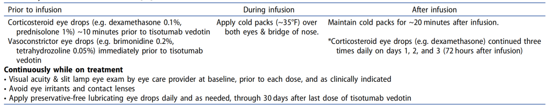 此外,治疗期间需要眼科提供基线时、每次输液前以及根据临床需要进行视力和裂隙灯眼部检查,患者应避免使用眼部刺激物和隐形眼镜,每天至少四次并根据需要使用无防腐剂的润滑眼药水,直至最后一次输液后30天。