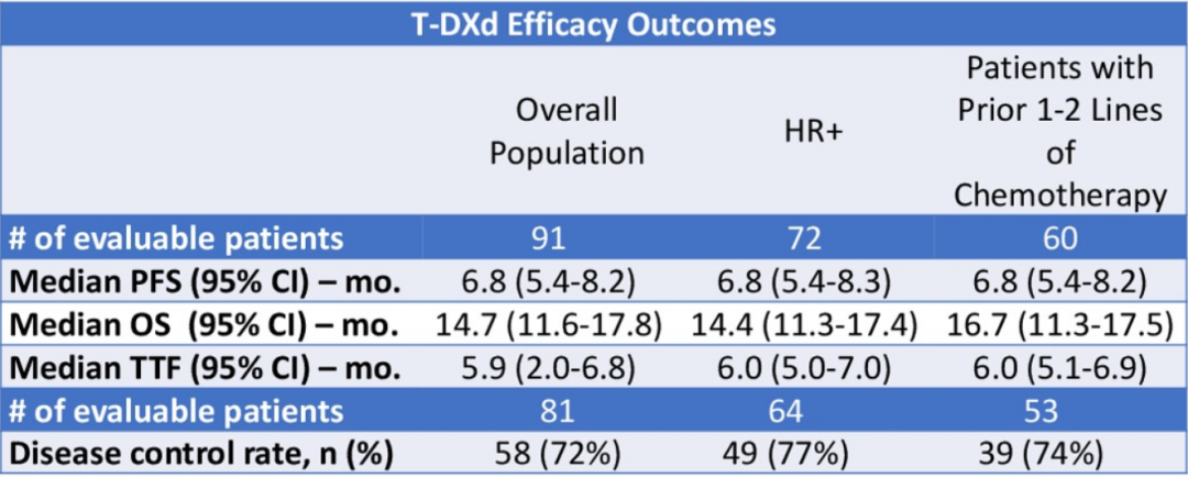 该研究共纳入91名患者,中位年龄为61岁(33~84岁)。72名患者(79%)为HR阳性,19名患者(21%)为HR阴性。76%患者的HER2免疫组织化学(IHC)表达为1+,24%患者为2+[PS1]/ISH-。91%的患者有内脏转移,4.4%的患者为单纯骨转移。T-DXd治疗开始前,既往接受0线、1线、2线及≥3线细胞毒性化疗药物的患者分别占11%、42%、24%和23%。11%的患者既往接受过SG(戈沙妥珠单抗)治疗。