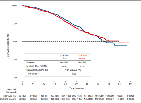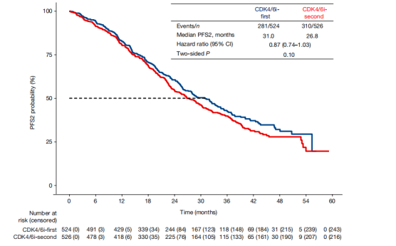 2023年ASCO大会上首次公布了SONIA研究数据,2024年11月该研究全文发表于《Nature》杂志。中位随访37.3个月,研究结果显示,一线治疗组的中位PFS2为31.0个月,二线治疗组为26.8个月(HR=0.87),两组PFS2不具有统计学差异。两组的中位OS分别为45.9个月和53.7个月,OS同样不具有统计学差异,患者生活质量也未得到改善。