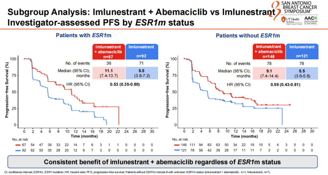 王树森教授:HR+/HER2-晚期乳腺癌是乳腺癌各亚型中占比最高的一种亚型,约70%的患者为这一亚型。这部分患者对于内分泌药物治疗敏感,目前临床中有很多内分泌药物或者内分泌联合治疗方案可供选择。我特别看好口服SERD类药物的治疗疗效,口服SERD+CDK4/6抑制剂联合方案也已经有初步临床研究结果公布,如2024年SABCS大会上的EMBER-3研究就探讨了SERD(Imlunestrant)作为内分泌单药治疗和Imlunestrant+阿贝西利治疗在HR+/HER2-晚期乳腺癌患者中的疗效和安全性。结果显示,Imlunestrant+阿贝西利相较于内分泌单药治疗,无论对于ESR1突变人群,还是CDK4/6抑制剂经治人群、PI3K通路改变人群,都有PFS的改善,因此,我觉得这样的组合是很值得进行进一步临床探索的。