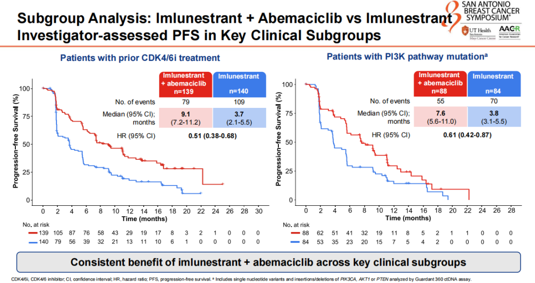 在HR+/HER2-晚期乳腺癌患者一线治疗领域,我们还在进行着更多探索,如CDK4/6抑制剂+ET治疗的基础上,HR+/HER2-晚期乳腺癌患者的生存是否还有进一步提升的空间?众所周知,PI3K/AKT/mTOR(PAM)通路是乳腺癌患者经常发生突变的通路,对于有PI3CA突变的乳腺癌患者,INAVO120研究提示,Inavolisib+哌柏西利+氟维司群可以为患者带来PFS的改善。该研究可能会给HR+/HER2-晚期乳腺癌患者带来更有前景、更有希望的治疗疗效,可能进一步提高患者的治疗选择。