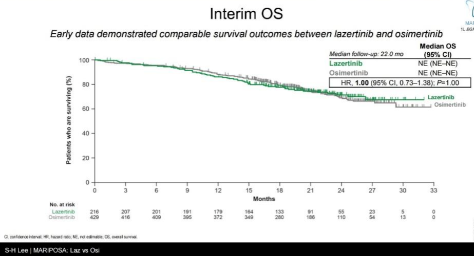 奥希替尼是携带EGFR敏感突变患者的一线标准治疗,Lazertinib是三代EGFR-酪氨酸激酶抑制剂(TKI)类药物,埃万妥单抗是一款靶向EGFR和c-MET的双特异性抗体药物,MARIPOSA研究旨在探索双药联合治疗相较于奥希替尼单药一线治疗携带EGFR敏感突变晚期NSCLC患者的疗效及安全性。在前期公布的数据中,联合治疗相较于奥希替尼单药展示出了更好的无进展生存期(PFS)的数据,本次旨在公布其长期随访结果和颅内随访结果。