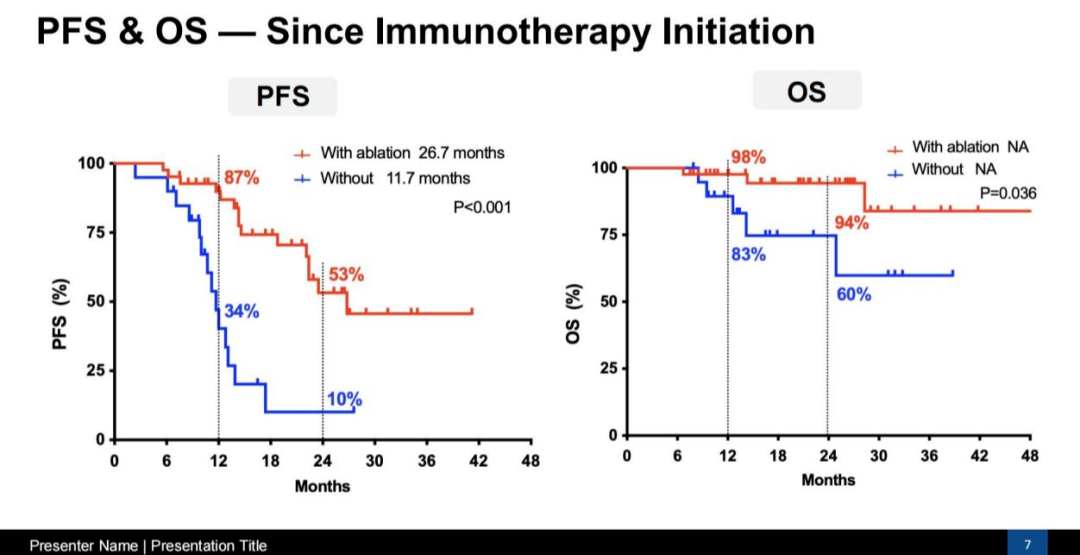 20%的晚期NSCLC患者经过免疫检查点抑制剂治疗后可形成寡残留状态,部分患者接受局部治疗后可观察到远隔效应,本研究旨在探索晚期接受免疫治疗后形成寡残留的患者,接受局部治疗的疗效和安全性。这是一项随机对照临床研究,纳入局部晚期或转移性NSCLC患者,患者一线接受免疫单药或免疫联合化疗,符合入组标准的患者按2:1的比例进行分组,一组接受免疫维持治疗,另一组在此基础上针对寡残留病灶接受局部治疗,主要研究终点为PFS。最终,免疫治疗组和联合治疗组分别入组42例和20例患者,腺癌占比分别为59.5%和65.0%,PD-L1≥50%的患者占比分别为23.8%和15%。联合治疗组和免疫治疗组中位PFS分别为26.7个月和11.7个月,2年PFS率分别为53%和10%,24个月OS率分别为94%和60%。