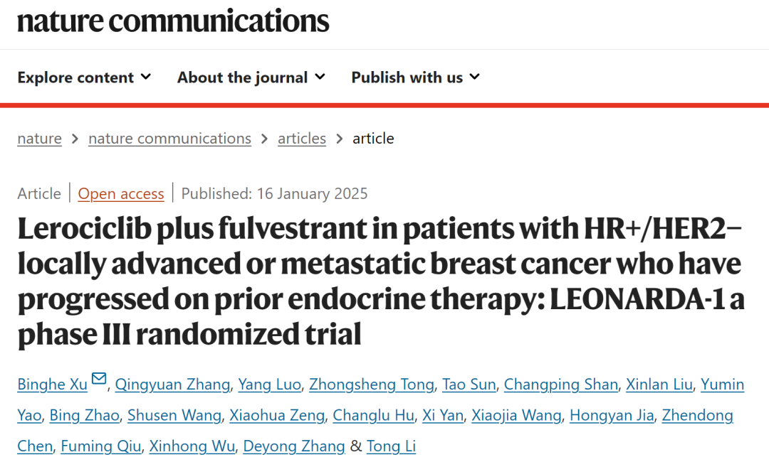 ?编者按:CDK4/6抑制剂已成为HR+/HER2-乳腺癌患者的重要治疗手段,涵盖了晚期解救治疗和早期辅助治疗。但不同CDK4/6抑制剂的疗效和安全性特征有所差异。为了进一步满足更多乳腺癌患者的治疗需求,提供更加丰富的治疗选择,仍需研发更加高效、低毒的CDK4/6抑制剂。2025年1月16日,中国医学科学院肿瘤医院徐兵河院士牵头开展的全国多中心Ⅲ期LEONARDA-1研究成果发表于《自然-通讯》(Nat Commun),该研究探讨了CDK4/6抑制剂Lerociclib联合氟维司群用于治疗内分泌耐药的HR+/HER2-晚期乳腺癌(ABC)患者的疗效和安全性。