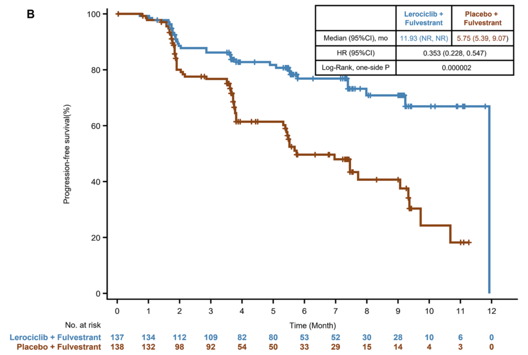 在次要终点方面:通过盲态独立中心审查(BICR)评估的PFS,也显示了Lerociclib组相较于安慰剂组的改善,疾病进展或死亡风险降低近65%(11.93 vs 5.75个月;HR 0.353,95%CI:0.228-0.547,P=0.000002)。