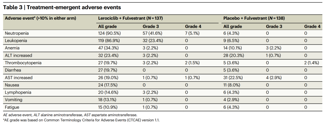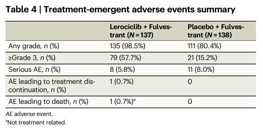 安全性分析如下表所示,Lerociclib组的≥3级不良事件(AE)发生率高于安慰剂组(57.7%vs 15.2%),但严重AE低于安慰剂组(5.8%vs 8.0%),Lerociclib组仅有1例(0.7%)患者因不良事件导致停药。Lerociclib较为常见的≥3级AE为中性粒细胞减少症(3级:41.6%,4级:5.1%)、白细胞减少症(23.4%,仅为3级)。