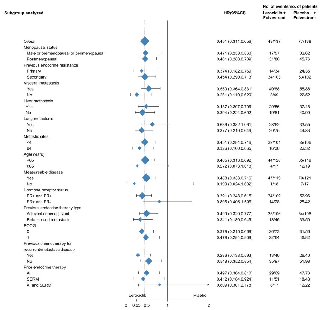 此次报道的LEONARDA-1研究,是一项在全国开展的多中心、随机、双盲、Ⅲ期研究。该研究入组了275例既往接受过内分泌治疗复发或进展的HR+/HER2局部晚期或转移性乳腺癌患者,随机接受Lerociclib 150 mg日二次或安慰剂联合氟维司群治疗。研究的主要终点结果显示:在研究者评估的无进展生存期(PFS)方面,Lerociclib组相较于安慰剂组延长了一倍多(11.07 vs 5.49个月),疾病进展或死亡风险显著降低近55%(HR 0.451,95%CI:0.311–0.656,P=0.000016)。亚组分析显示,大多数亚组患者有一致的Lerociclib组PFS获益趋势。
