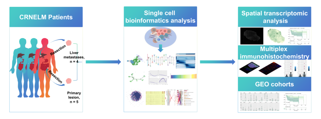 该研究通过结合单细胞转录组与空间转录组测序,首次揭示了结直肠神经内分泌肿瘤肝转移(CRNELM)患者原发灶与肝转移灶的细胞和分子差异,识别了可能驱动肿瘤微环境差异并支持转移性肿瘤生长的不同细胞亚群及受体-配体相互作用。这些研究结果为CRNELM的潜在治疗靶点提供了重要线索,并为CRNELM患者的临床管理策略提供了新的思路。
