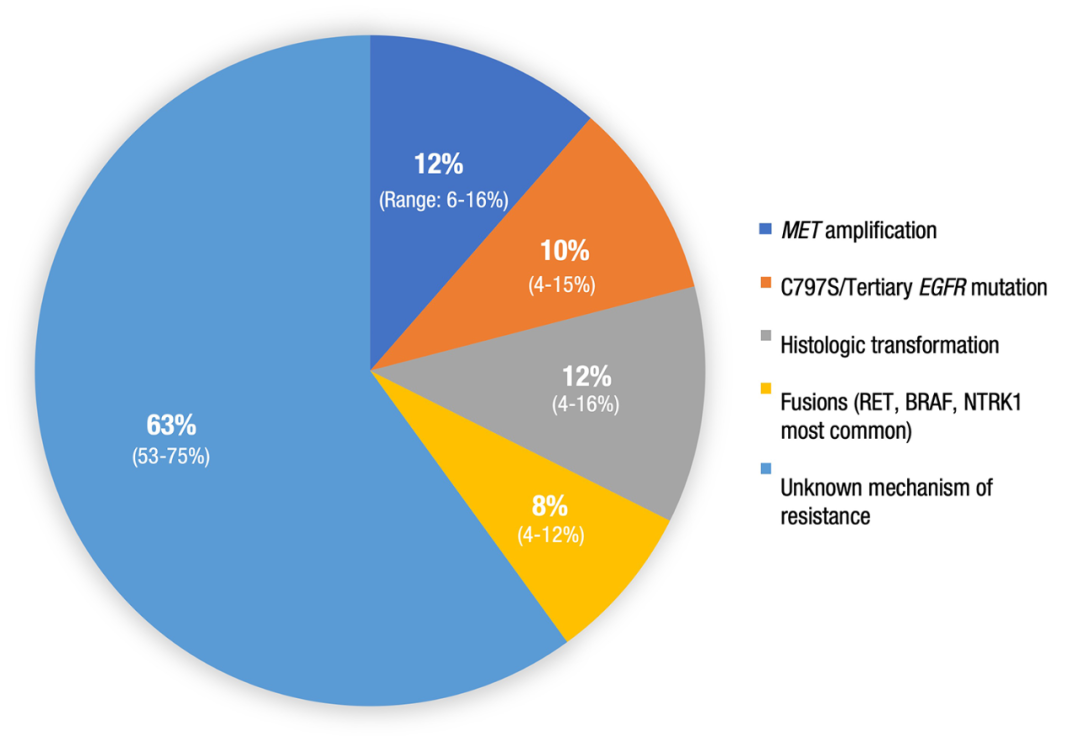 其他一线强化方案旨在防止获得性耐药或耐药克隆。正在进行的I/II期研究正在评估奥希替尼+吉非替尼的效果,依据是EGFR双重抑制可预防两种最常见的EGFR-TKI在靶耐药突变发生:C797S和T790M。[10]