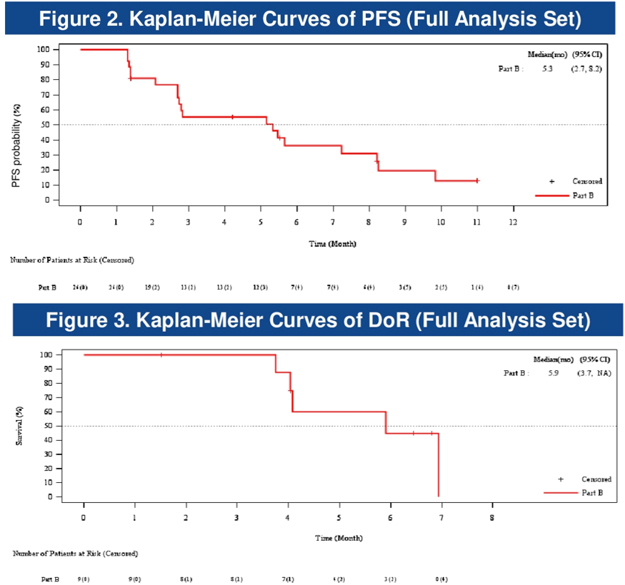截至2024年8月10日,共有26名患者接受了Fexagratinib与替雷利珠单抗联合治疗,大多数患者未接受过治疗,26名患者中有57.7%为男性。9名患者确认存在FGFR3突变或融合,24名患者存在FGFR3过表达。在22名具有可评估PD-L1状态的患者中,86.4%的患者PD-L1检测结果为阴性(CPS<10)。在疗效方面,在24名可评估患者中,9例(37.5%)获得了部分缓解(PR)。在具有FGFR3过表达但无突变融合的可评估患者中,ORR为37.5%(6/16)。治疗的中位无进展生存期(mPFS)为5.3个月(95%CI:2.7-8.2),中位缓解持续时间(mDoR)为5.9个月(95%CI:3.7,NA)。至数据截止日期,有4名患者仍在接受治疗。