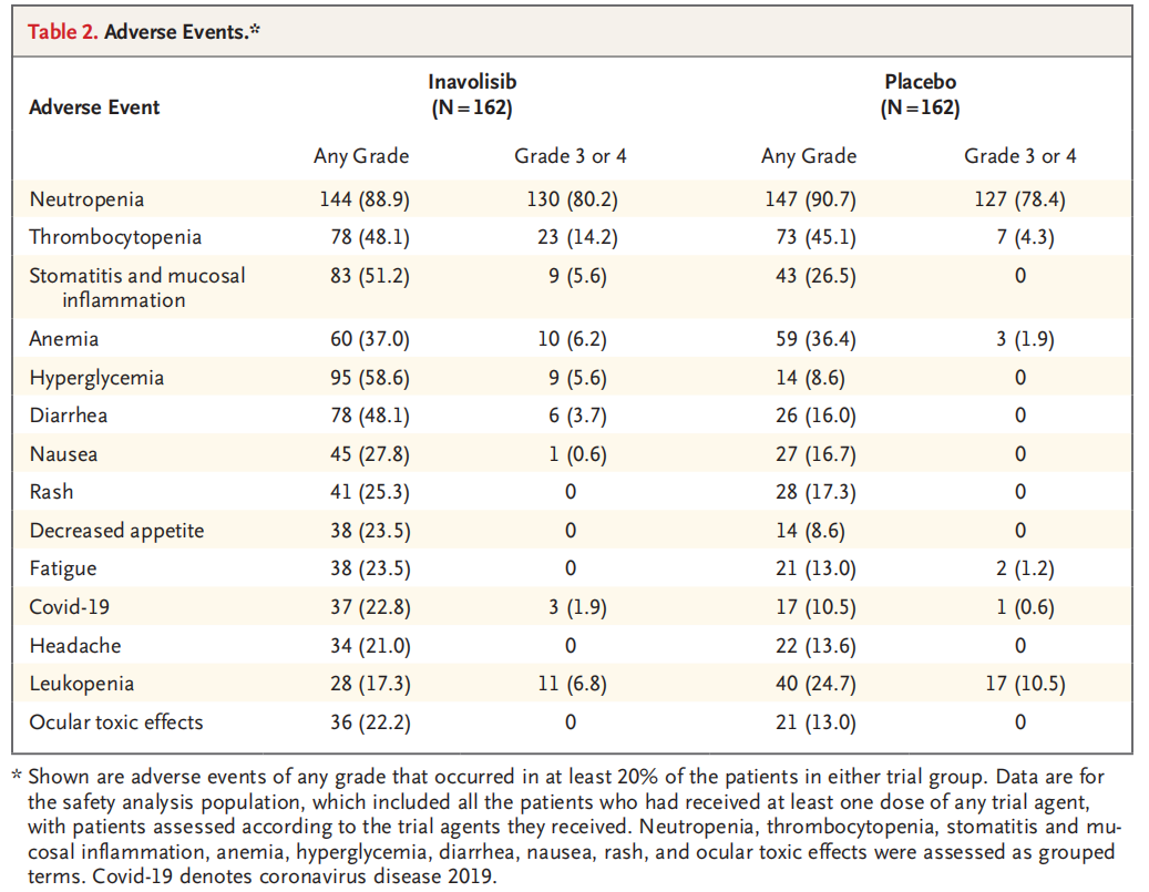 在安全性分析人群中,伊那利塞组98.8%的患者和安慰剂组100%的患者发生了至少1起不良事件(AE)。两组中至少有20%患者发生的任何级别选定不良事件包括中性粒细胞减少(inavolisib组88.9%的患者发生,安慰剂组90.7%的患者发生)、口腔炎或黏膜炎(分别为51.2%和26.5%)、高血糖(分别为58.6%和8.6%)、腹泻(分别为48.1%和16.0%)以及皮疹(分别为25.3%和17.3%)(表2)。伊那利塞组和安慰剂组的3/4级中性粒细胞减少发生率分别为80.2%和78.4%。3/4级高血糖分别为5.6%和0%;3/4级口腔或黏膜炎5.6%和0%;3/4级腹泻分别为3.7%和0%。未观察到3/4级皮疹。伊那利塞组6.8%的患者和安慰剂组0.6%的患者因不良事件停用任何试验药物。