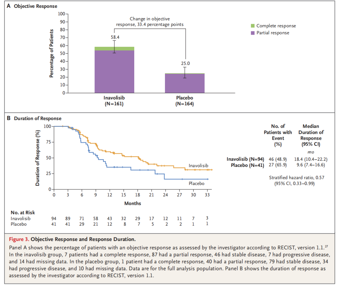 伊那利塞组58.4%的患者和安慰剂组25.0%的患者达到了客观缓解(差异为33.4%;95%CI:23.3~43.5)。中位缓解持续时间(DOR)分别为18.4个月和9.6个月(HR 0.57;95%CI:0.33~0.99)(图3)。