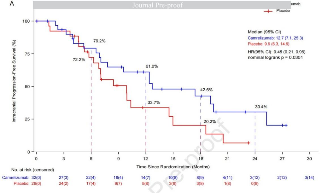 研究方法:这是一项安慰剂对照的随机双盲临床试验。纳入初治且存在脑转移的晚期NSCLC患者,患者不携带EGFR及ALK突变。符合入组标准的患者按照1:1的比例随机分为含铂双药化疗±卡瑞利珠单抗治疗。4-6周期后接受维持治疗。诱导治疗阶段接受紫杉醇治疗的患者,维持治疗阶段可以换用培美曲塞进行维持治疗。由研究者决定是否接受颅脑放疗,如果有必要,应当在首次给药42天内接受放疗。主要研究终点为颅内无进展生存时间和系统无进展生存时间。研究计划入组200例患者,但由于全球治疗模式的改变,入组提前终止。