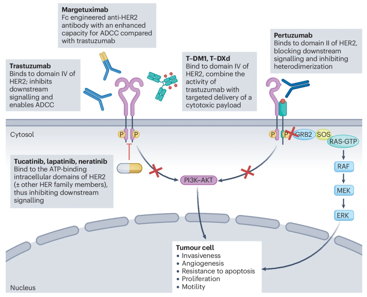 HER2是酪氨酸激酶表皮生长因子受体(EGFR)家族成员,具有胞外配体结合结构域、跨膜区域、胞内酪氨酸激酶结构域的特征结构。在与配体结合后,HER2会发生同源二聚化或异源二聚化,并激活胞内酪氨酸激酶结构域,最终导致下游RAS-MARK、PI3K-AKT-mTOR等有丝分裂信号通路激活。在FDA批准的抗HER2靶向治疗药物中,曲妥珠单抗、帕妥珠单抗、马吉妥昔单抗、T-DM1、T-DXd通过与HER2胞外结构域结合发挥作用,拉帕替尼、图卡替尼、奈拉替尼则与胞内酪氨酸激酶结构域结合抑制信号传导。除了阻断HER2过表达驱动的致癌信号外,抗HER2靶向治疗药物还有存在其他抗癌机制,如大分子单抗存在抗体依赖性的细胞介导的细胞毒作用(ADCC)、抗HER2 ADC还能将自身携带的细胞毒分子特异性递送到肿瘤细胞发挥细胞毒作用。