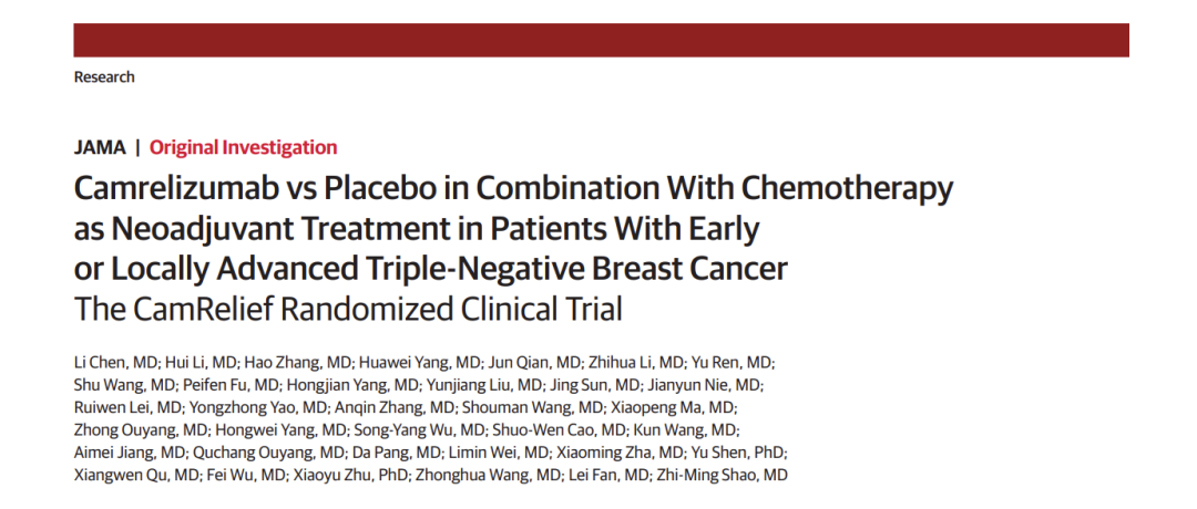 研究题目:Camrelizumab vs Placebo in Combination With Chemotherapy as Neoadjuvant Treatment in Patients With Early or Locally Advanced Triple-Negative Breast Cancer:The CamRelief Randomized Clinical Trial