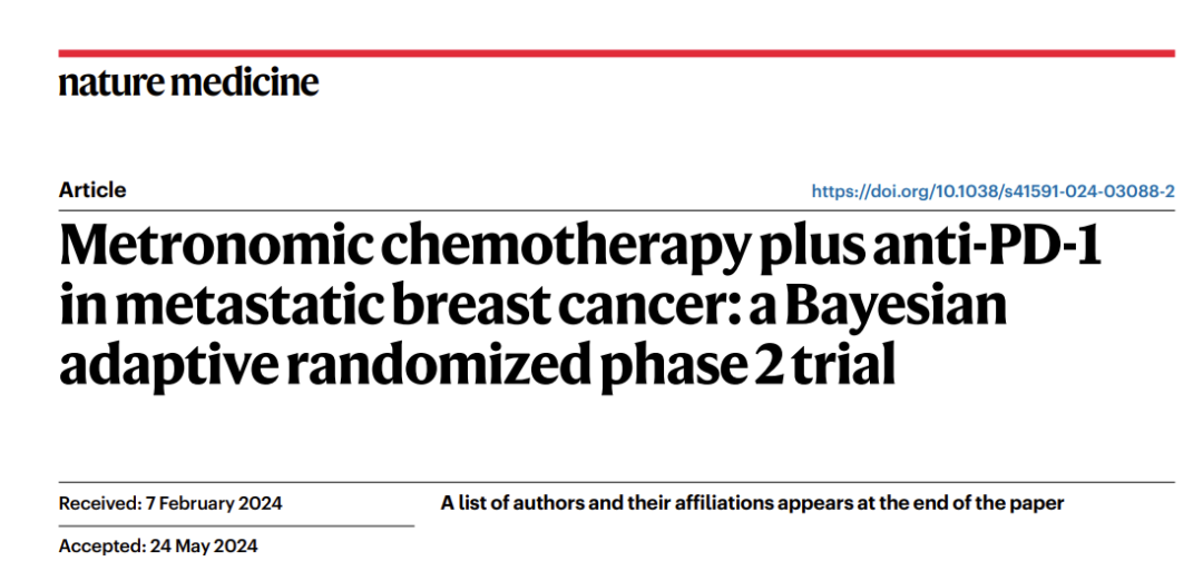 研究题目:Metronomic chemotherapy plus anti-PD-1 in metastatic breast cancer:a Bayesian adaptive randomized phase 2 trial