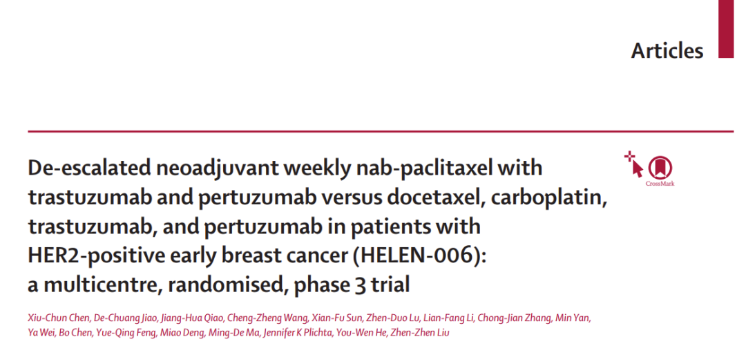 研究题目:De-escalated neoadjuvant weekly nab-paclitaxel with trastuzumab and pertuzumab versus docetaxel,carboplatin,trastuzumab,and pertuzumab in patients with HER2-positive early breast cancer(HELEN-006):a multicentre,randomised,phase 3 trial