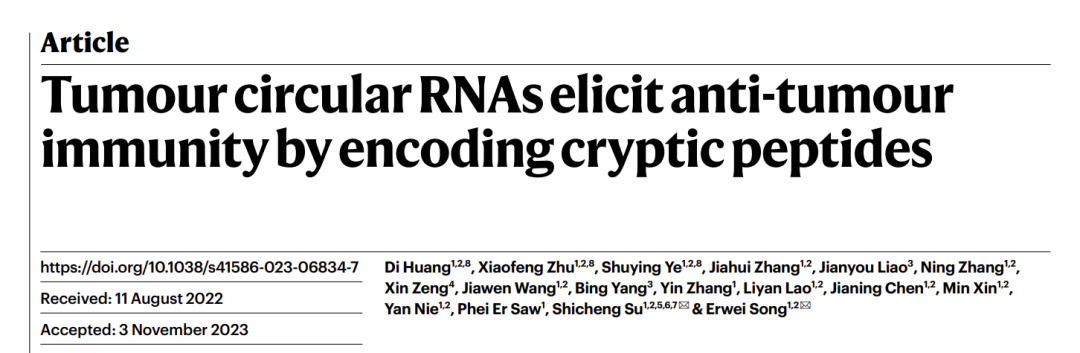研究题目:Tumour circular RNAs elicit anti-tumour immunity by encoding cryptic peptides