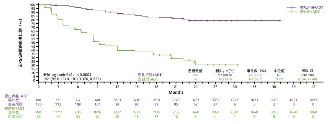 China ARCHES研究是一项针对初治mHSPC患者的III期临床研究。该研究将接受ADT联合恩扎卢胺治疗的患者试验组,而传统的单药ADT疗法作为对照组。研究结果显示在ADT联合恩扎卢胺能够显著延长疾病的控制时间,包括使PSA进展风险显著降低87%(HR 0.130,95%CI:0.076-0.222,P<0.0001),使影像学疾病进展或死亡风险显著降低67%(HR 0.330,95%CI:0.196-0.556,P<0.0001)等[5]。
