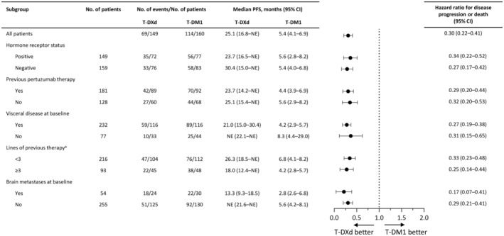 T-DXd组与T-DM1组研究者评估的mPFS为26.3个月vs 7.0个月(HR 0.30;95%CI 0.22–0.41)。在激素受体状态、既往帕妥珠单抗治疗、基线内脏转移、既往治疗线数和基线脑转移等亚组中,均观察到了T-DXd一致的PFS获益。