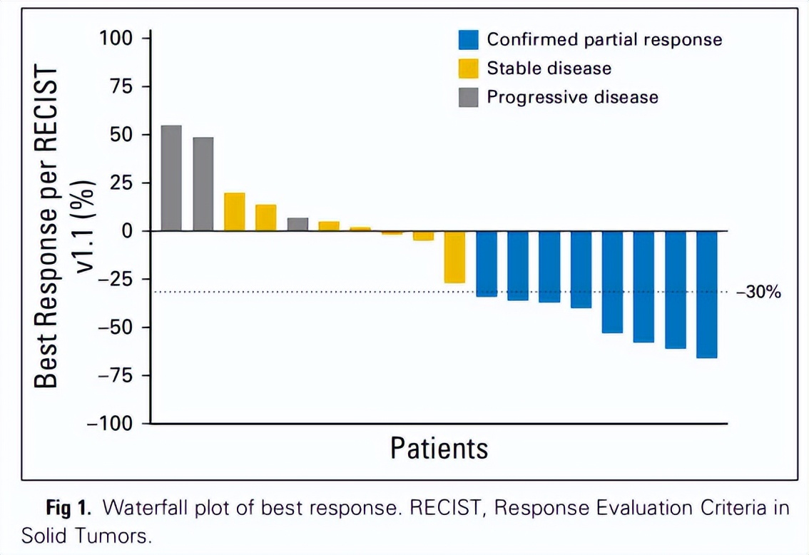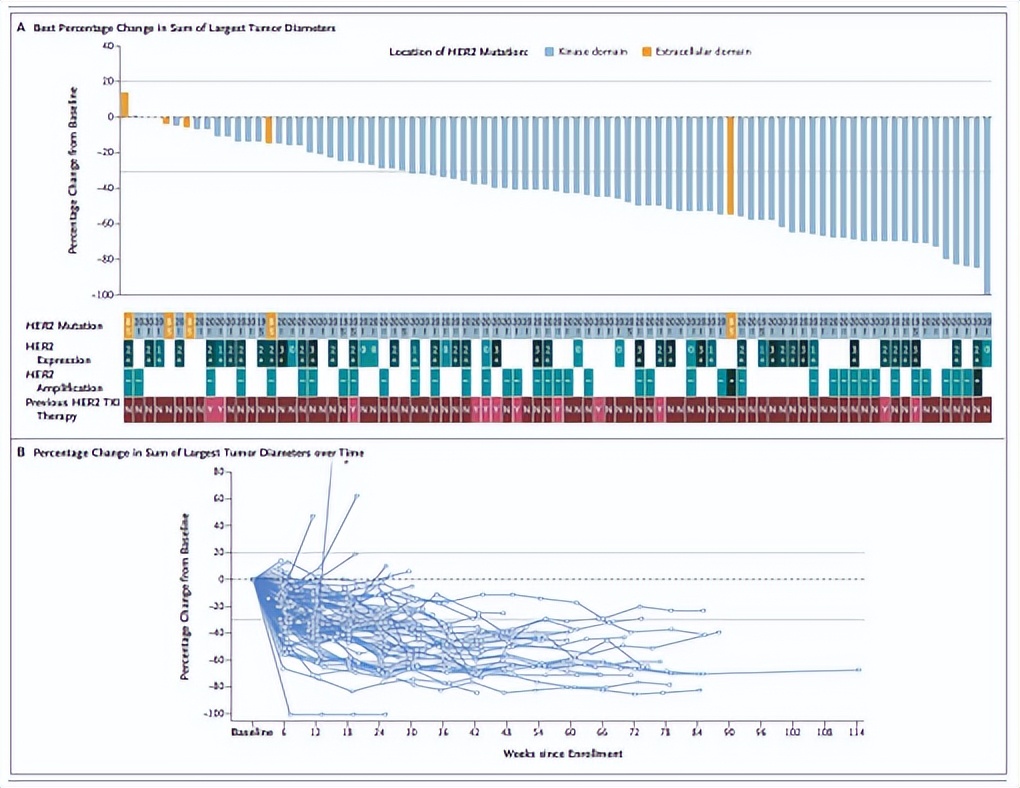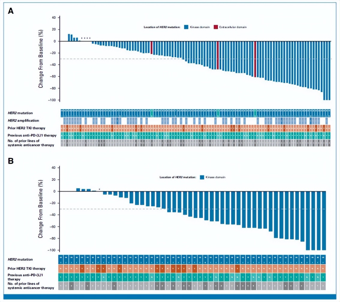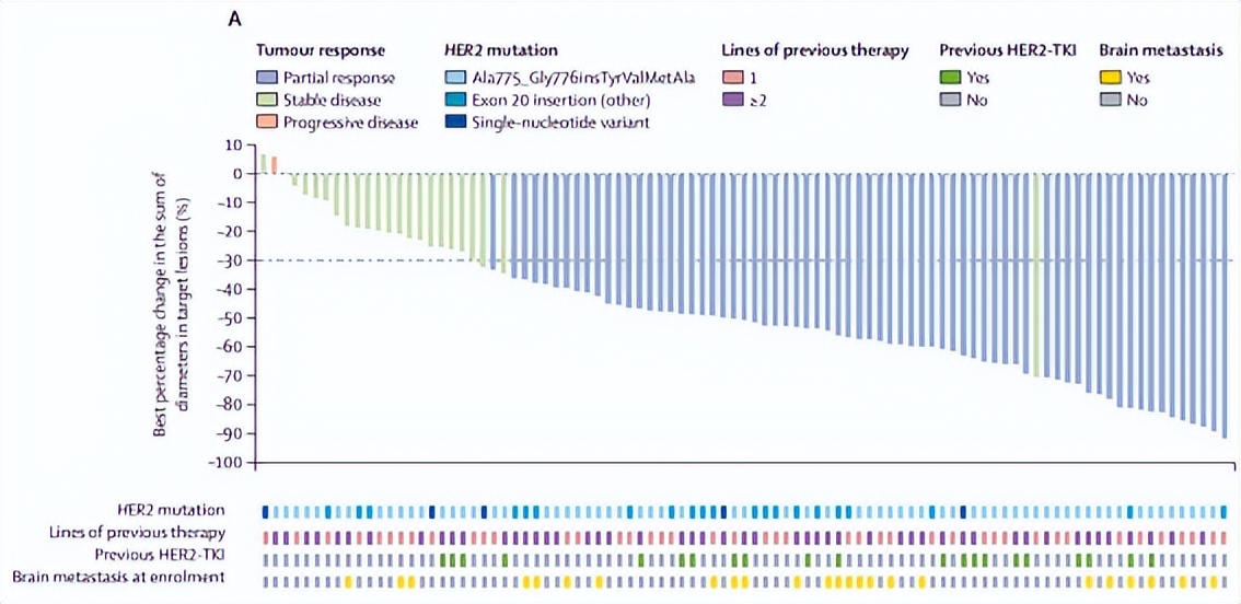 最终,研究共纳入94例患者进行疗效评估。98%的患者有远处转移,包括26%的患者有脑转移,23%的患者既往接受过HER-2-TKI治疗,97%的突变位于酪氨酸激酶域,免疫组化0+、1+、2+患者占比分别为49%、30%和21%,99%的患者不携带HER-2扩增。