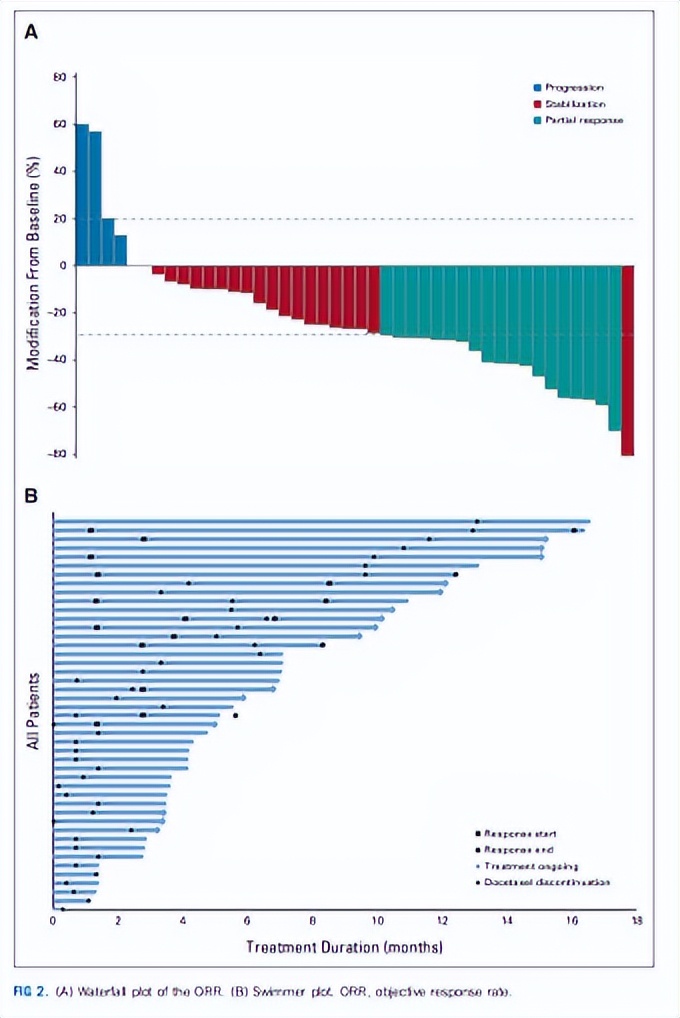 所有患者均出现任何级别治疗相关不良反应,其中,3度以上不良反应发生率为62%,包括中性粒细胞计数下降40%,白细胞计数下降27%,贫血23%,血小板计数下降11%,淋巴细胞计数下降7%。7%的患者出现间质性肺疾病,中位出现时间84天。分别有30%、17%和1%的患者因不良反应而导致治疗中断、剂量降低或永久性治疗终止。严重治疗相关不良反应发生率为23%。2例患者因不良反应而导致死亡,但研究者判断与治疗药物无关。亚组分析显示,有脑转移和无脑转移的患者,ORR分别为87.5%和68.6%;既往接受过HER-2-TKI治疗和未接受HER-2-TKI治疗的患者,ORR分别为77.3%和72.2%。
