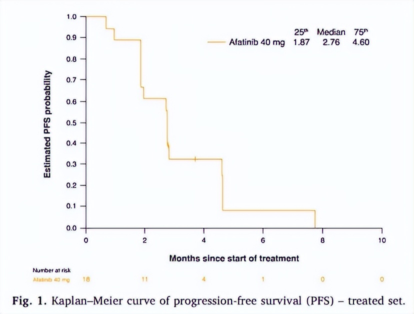2、阿法替尼:作为首款泛HER抑制剂,阿法替尼率先在EGFR突变的晚期肺癌患者中获批适应症。虽然该药物也该函HER-2靶点,但效果不佳。在一项单臂、前瞻性临床研究中,研究者纳入经过1-2线治疗失败的晚期NSCLC患者,给予标准剂量的阿法替尼治疗。18例患者中,无患者出现客观响应,DCR为61.1%,中位PFS和中位OS分别为2.76个月和10.02个月5。