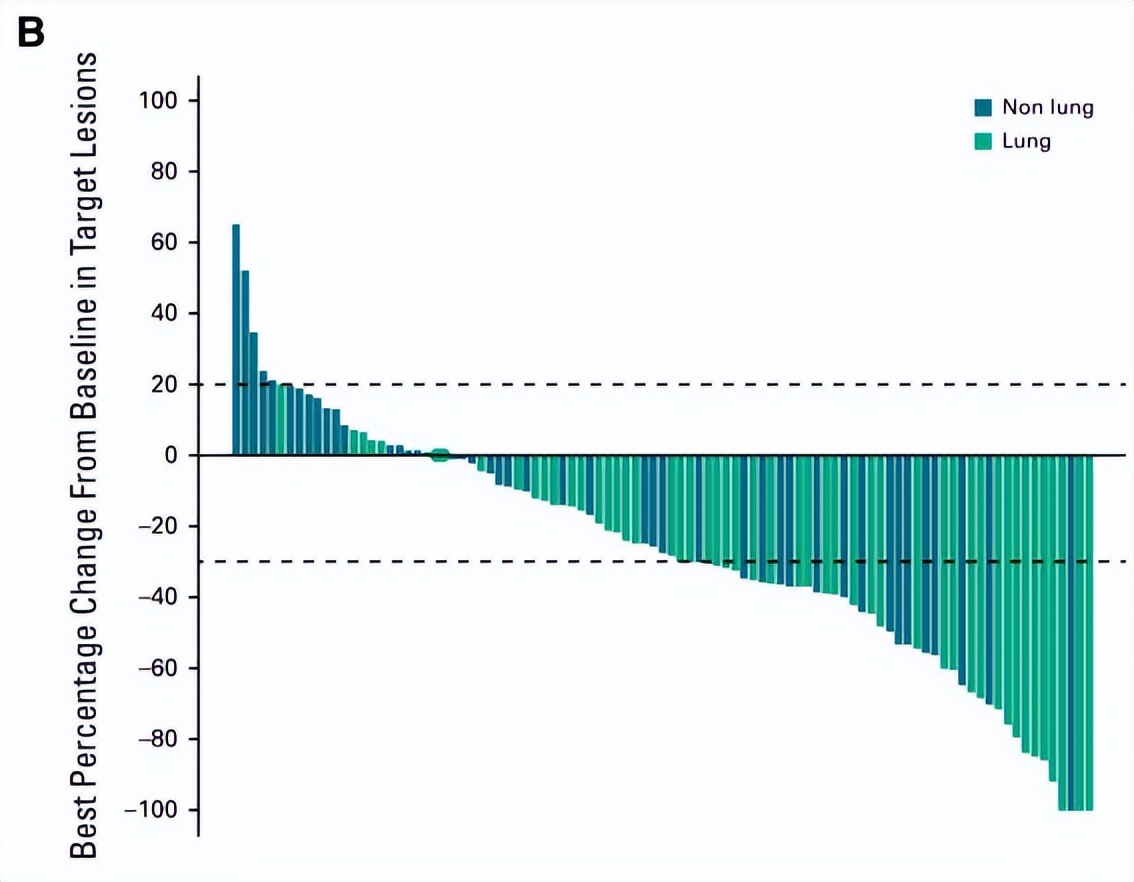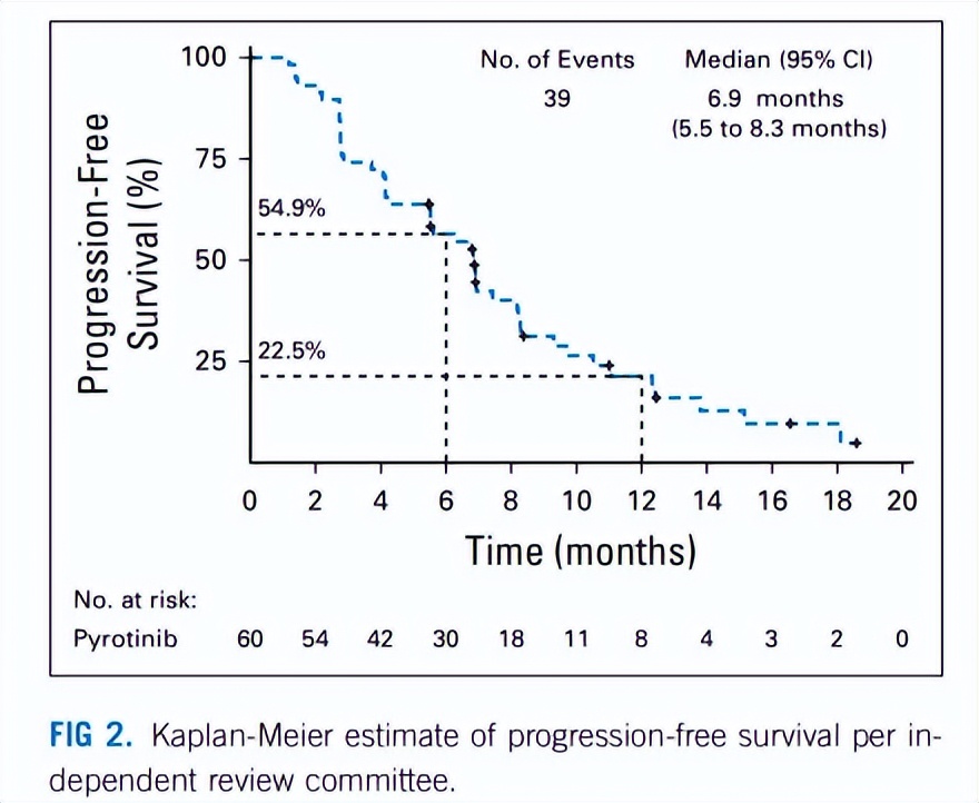 研究共纳入105例患者,51%的患者为非小细胞肺癌,55%的患者携带HER-2突突变,17%携带HER-2重排,中位治疗线数为4线。2例患者出现剂量限制性毒性,分别是在240mg,口服,每日一次剂量组出现一例3度腹泻和360mg,口服,每日一次剂量组出现一例3度血小板数量下降。3度以上治疗相关不良反应发生率为10%,包括谷丙转氨酶升高4%,谷草转氨酶升高2%,皮疹2%。严重不良反应发生率为37%。ORR和DCR分别为30%和83%。中位DOR为12.7个月,中位PFS为8.0个月。在非小细胞肺癌患者中,ORR和DCR分别为35%和93%,中位DOR未达到,中位PFS为8.7个月。