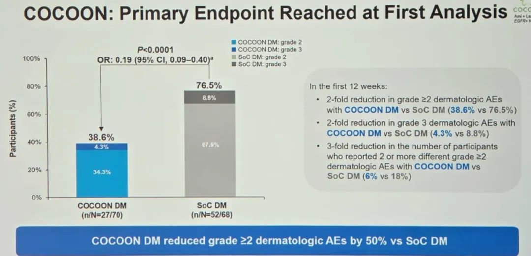 首次预设中期分析(中位随访4.2个月)显示达到主要终点(前12周≥2级皮肤不良事件发生率)。≥2级皮肤不良事件发生率从标准管理的76.5%显著降至38.6%(p<0.0001),头皮不良事件降幅(70%)最大(29%vs 9%)。3级皮肤不良事件发生率从8.8%降至4.3%。