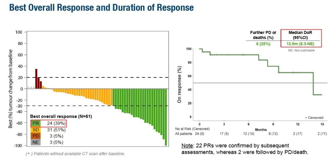 针对61例可评估患者中,最佳总体疗效(BOR)为疾病稳定(SD)51%、部分缓解(PR)39%、疾病进展(PD)5%、不可评估5%,中位缓解持续时间(DoR)达13.9个月(95%CI 8.3-不可评估[NE])。