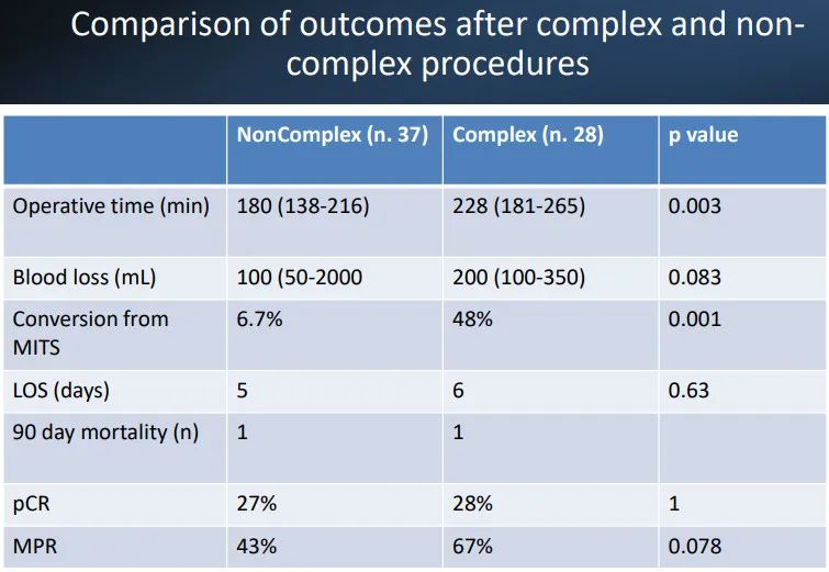 2025 ELCC发布的研究结果显示,在65名接受化疗-纳武利尤单抗后手术切除的患者中,最常见的手术是肺叶切除术(86%)。共有28例(43%)手术被归类为复杂。复杂手术病例的中位手术时间为228分钟,而非复杂病例的中位手术时间为180分钟(p=0.003)。53例患者初始手术选择微创手术,复杂病例转开放手术率为48%,而非复杂病例转开放手术率为6.7%(p=0.001)。
