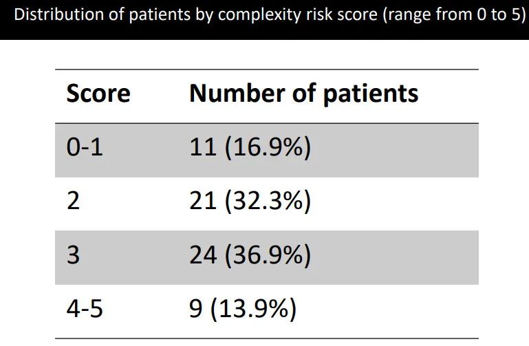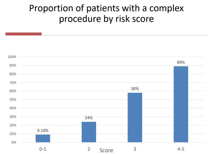 根据患者的评分将患者分为不同的风险等级(0-5)。复杂手术的比例随着评分的升高而增加(从评分<2的患者中的9.1%增加到评分>3的患者中的89%,p=0.004)。