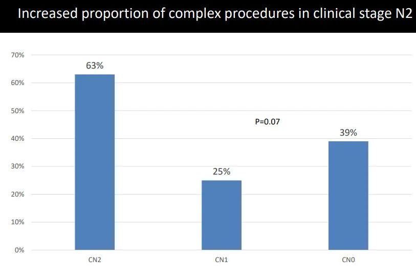 未发现与手术复杂性相关的患者相关因素(PRF)。在肿瘤相关因素(TRF)中,淋巴结c分期显示,在cN2患者中手术复杂性有增加的趋势(cN2 63%复杂,vs.cN1 25%vs.cN0 39%,p=0.07)。