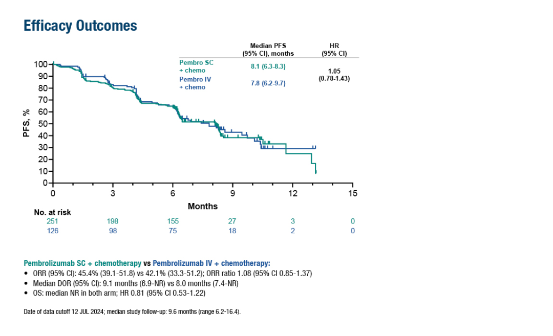 中位随访9.6个月后,皮下组与静脉组的客观缓解率(ORR)分别为45.4%和42.1%,中位无进展生存期(PFS)分别为8.1个月和7.8个月(风险比1.05;95%CI 0.78–1.43),两组均未达到中位总生存期(OS)。