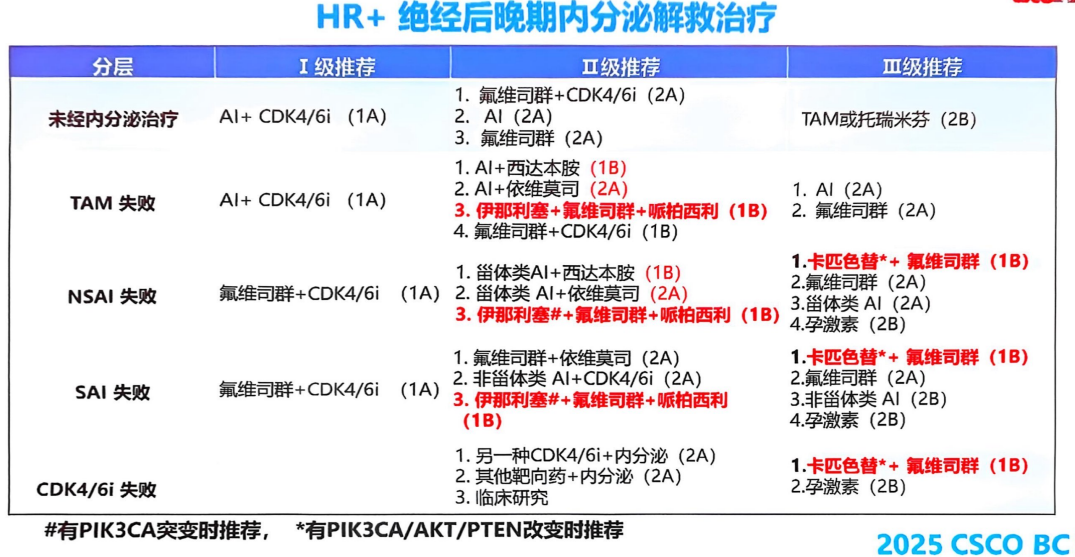 在激素受体阳性领域,辅助强化治疗的更新促使我们对这部分人群进行了分层调整。在晚期治疗阶段,CDK4/6抑制剂治疗后疾病进展的患者,随着PAM通路抑制剂获批上市,指南也根据相关内容进行了调整。
