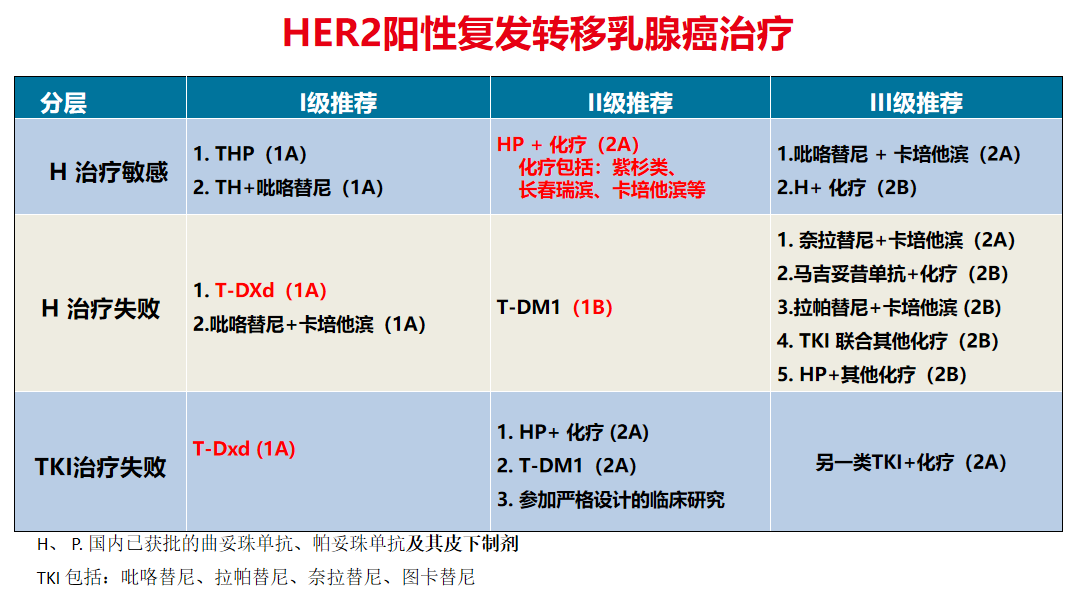 在HER2阳性乳腺癌晚期治疗阶段,由于T-DXd纳入医保,其证据级别和推荐等级也都做了相应调整。