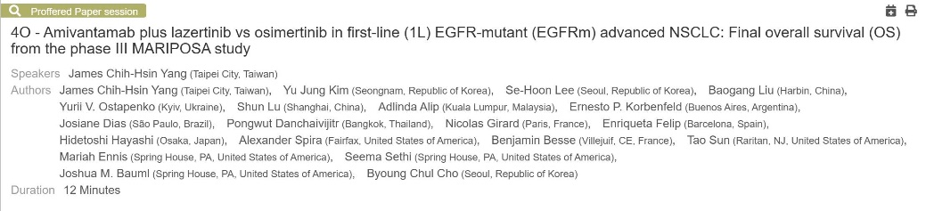 埃万妥联合Lazertinib vs奥希替尼一线治疗EGFR突变非小细胞肺癌患者的疗效及安全性:III期MARIPOSA研究的OS分析