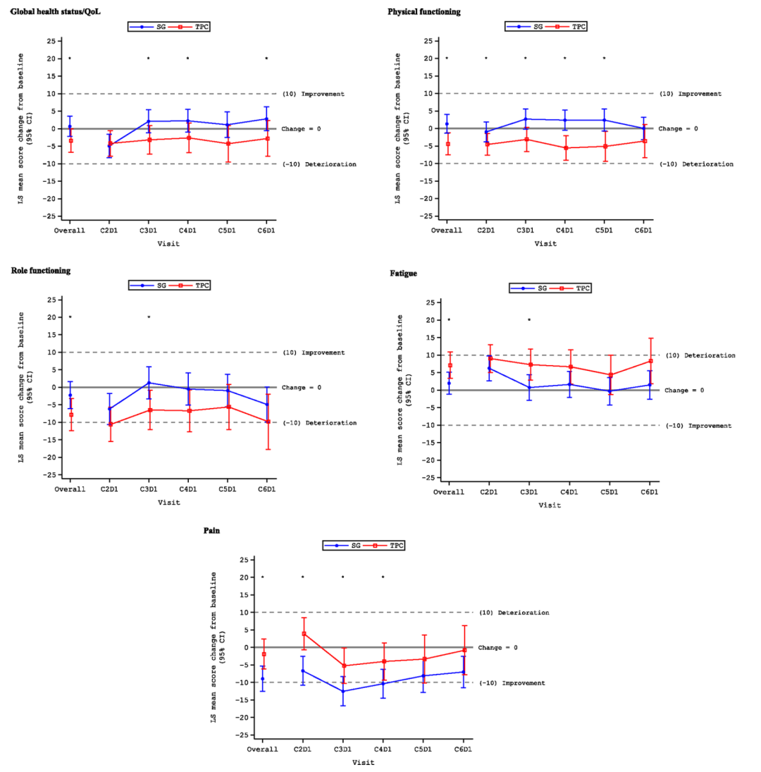在生活质量(QoL)方面,ASCENT研究患者报告的结局(PRO)取得了积极结果,显示SG较TPC在整体生存状况/生活质量(GHS/QoL)、生理机能(PF)、生理职能(RF)、虚弱、疼痛五个QoL维度的得分均具有显著改善[16]。