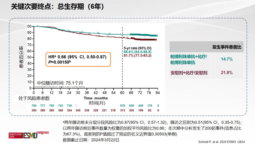 KEYNOTE-522是一项具有里程碑意义的III期临床研究。在新辅助阶段,患者被随机分到帕博利珠单抗联合化疗组和安慰剂联合化疗组,术后继续进行辅助治疗。截至2024年3月22日,中位随访75.1个月。新辅助化疗联合帕博利珠单抗组5年OS率达86.6%,显著优于联合安慰剂组81.7%(HR=0.66,95%CI:0.50-0.87,P=0.0015)。