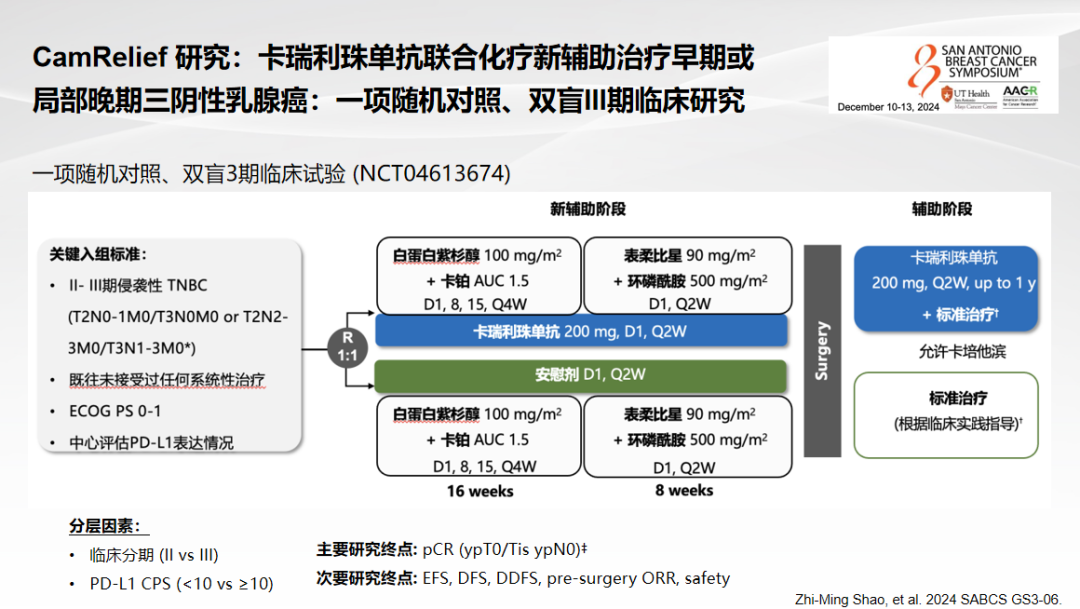CamRelief研究(NCT04613674)聚焦于中国三阴性乳腺癌患者群体。该研究证实,卡瑞利珠单抗联合化疗用于新辅助治疗,能够显著提高患者的pCR率。中位随访14.4个月,在标准化疗方案上加用卡瑞利珠单抗的患者,其病理学完全缓解率为56.8%,显著优于对照组的44.7%,绝对获益高达12.1%。研究为中国乳腺癌免疫治疗的临床实践提供了有力的支持[14]