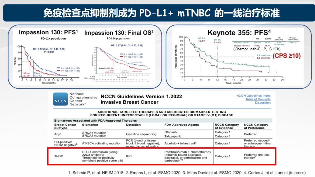 基于IMpassion130、KEYNOTE-355等研究成果,NCCN指南明确推荐,对于PD-L1阳性(CPS≥10)的转移性三阴性乳腺癌(mTNBC)患者,免疫联合化疗作为一线标准方案[5-7]