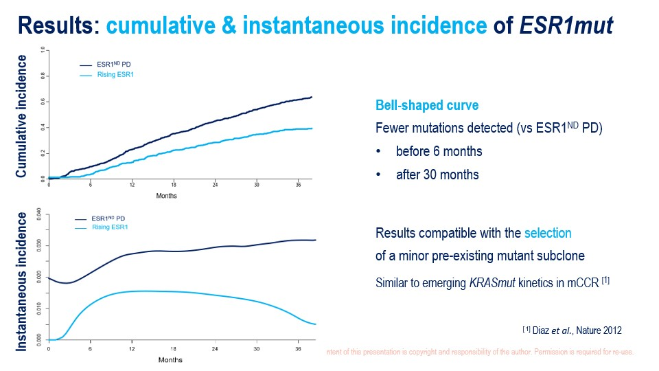 △PADA-1研究的二次分析中,ESR1mut随时间的发病率分布不均,在HR+/HER2-乳腺癌患者中,前6个月前和30个月后的检出率较低(2025年ESMO BC年会,摘要1O)。